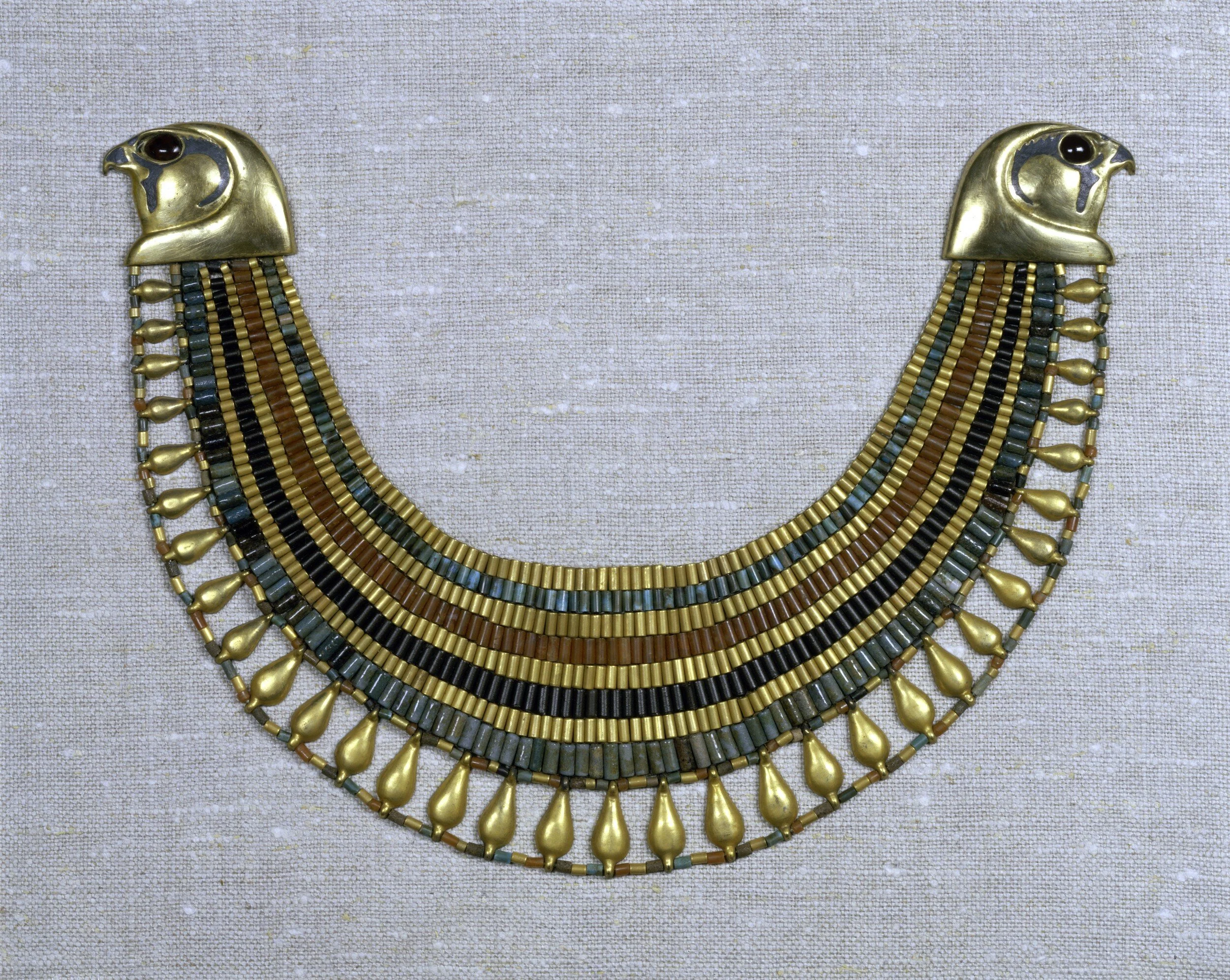 The beaded broad collar of Senebtisi (ca. 1850-1775 BCE), made to fit the nape of the neck thanks to 2-dimensional contouring of the sort already present in Egypt by ca. 2500 BCE. Made of gold, carnelian, turquoise and faience, the collar is preserved at the Metropolitan Museum of New York as Accession No. 08.200.30. Image courtesy Metropolitan Museum of Art, New York.